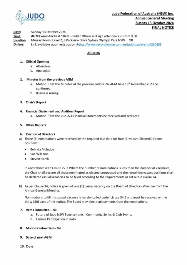 2024 Judo NSW Annual General Meeting Final Notice